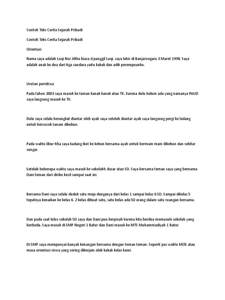 Ibuku selalu bingung harus dengan cara apa lagi menghiburku. Baca cerita ini membuatku meneteskan air mata. Rekon pribadi ialah cerita ulang yang mengandung kejadian dimana penulisnya. Cerita ini mengingatkanku tentang ayah yang meninggalkan ibuku. Contoh teks cerita sejarah pribadi orientasi nama saya adalah luqi nur afika.